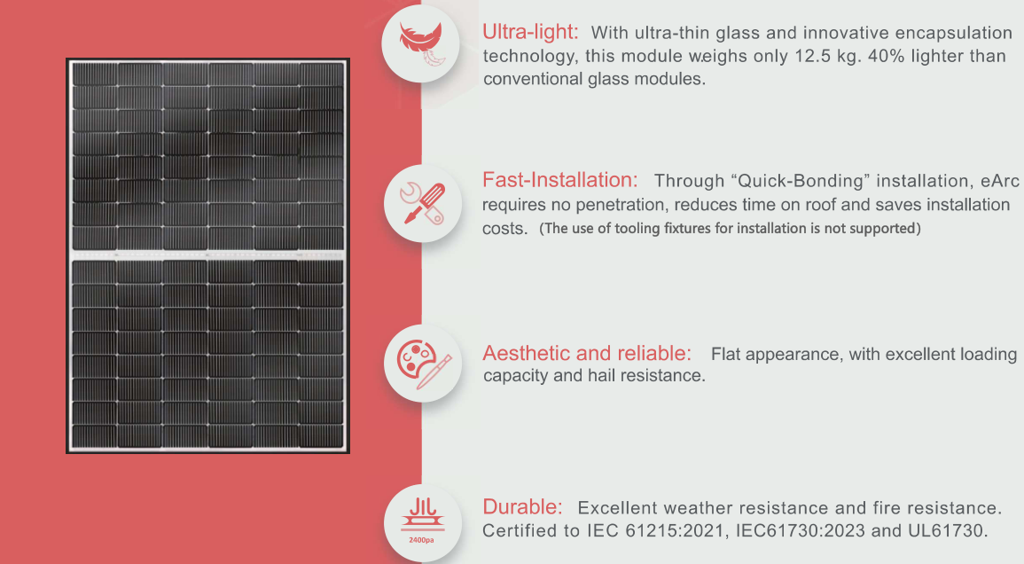 轻薄可弯曲,适用于不可承重屋顶、车辆等场景。